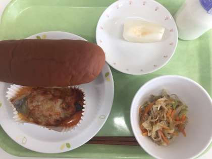 献立 ココアパン 魚のピザ風 もやしサラダ 梨 牛乳