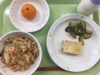 献立 子ぎつねごはん 擬製豆腐 きゅうりの南蛮漬け 冷凍みかん 牛乳