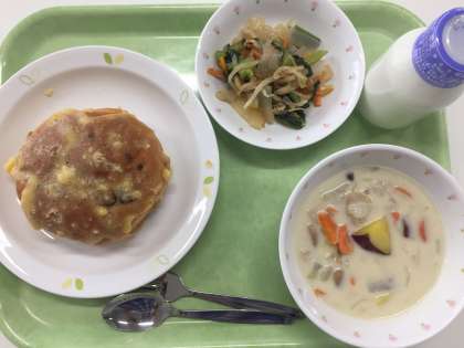 献立 ビスキュイパン 秋野菜のシチュー こんにゃくサラダ 牛乳