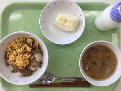献立 大豆とごぼうのそぼろご飯 さつま汁 りんご 牛乳