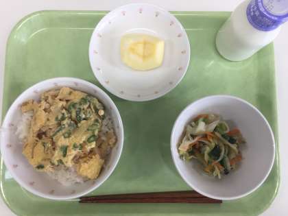 献立 親子丼 みそドレサラダ りんご 牛乳