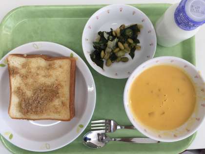 献立 セサミトースト キャロットシチュー 浸し豆のサラダ 牛乳