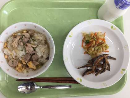 献立 鶏飯(けいはん) きびなごのごま揚げ 白菜のおかか和え 牛乳