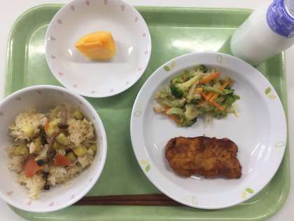 献立 吹き寄せご飯 魚の龍田揚げ ブロッコリーのサラダ かき 牛乳