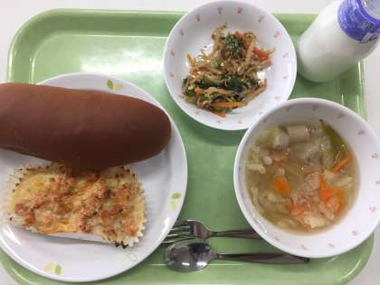 献立 ココアパン ロヒ・ラーティコ(フィンランド料理) 豆のスープ 野菜のごま酢和え 牛乳