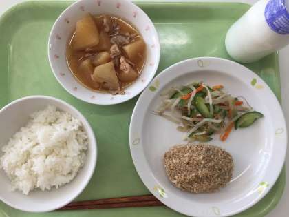 献立 ご飯 肉じゃがコロッケ 塩ナムル 大根のべっこう煮 牛乳