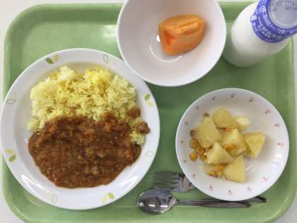 献立 キーマカレー コーンポテト 柿 牛乳