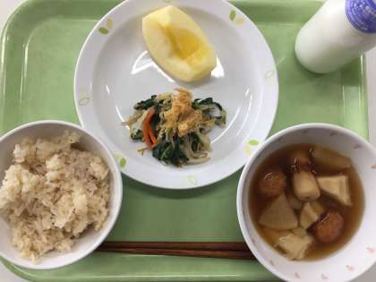 献立 茶飯 おでん あぶらあげのサラダ りんご 牛乳
