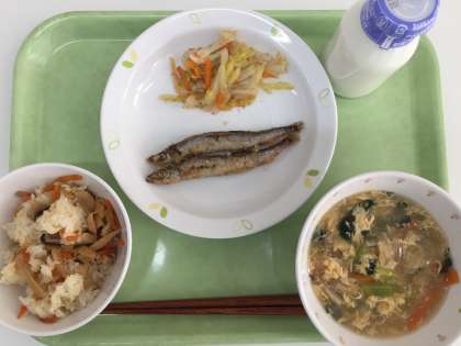 献立 加薬ごはん かきたま汁 ししゃものから揚げ 白菜のおかか和え 牛乳