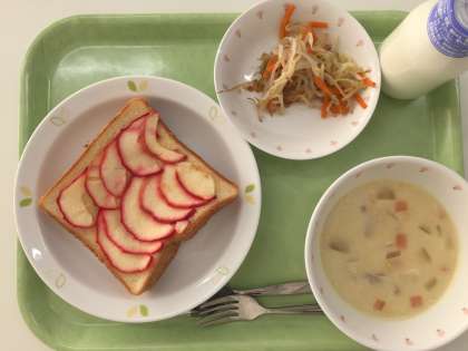 献立 アップルシュガートースト コーンポタージュ もやしサラダ 牛乳