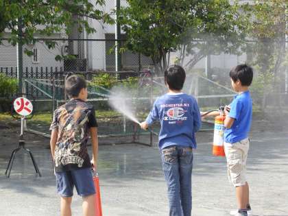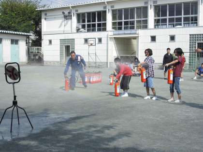 10月5日の避難訓練で6年生が消火器の使い方を学びました。目標にうまく当てるのが難しかったです。