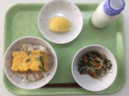 献立 親子丼 野菜のごま酢和え りんご 牛乳
