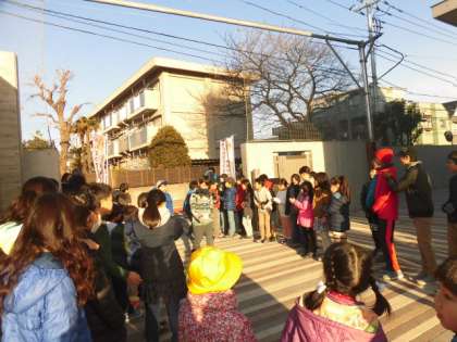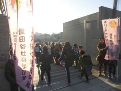 異学年で構成された縦割り班の子どもたちが、正門に立って元気よくあいさつをしています。地域の方や、保護者の方、世田谷中の生徒も参加してあいさつ運動を盛り上げてくださっています。一度にたくさんの人から元気よくあいさつされて、照れくさそうに通る子もいますが、笑顔であいさつを交わしています。