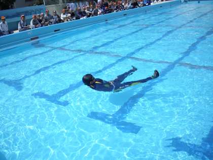 いよいよ、子ども達の実習が始まりました。洋服を着て水の中に入る経験は、まずないので、テンションが上がってしまい、注意されることもありましたが、洋服を着て泳いだり動いたりすることの難しさを感じていました。その後は、洋服に空気を入れたり、ペットボトルや袋を使って上手に浮いていました。また、「エレメンタリーバックストローク」という背浮きをしながら泳ぐ方法も学びました。