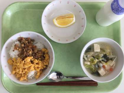 献立 大豆とごぼうのそぼろごはん 飛鳥汁 くだもの 牛乳