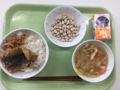 献立 いわしのかば焼き丼 たくあん炒め みそ汁 福豆 オレンジジュース