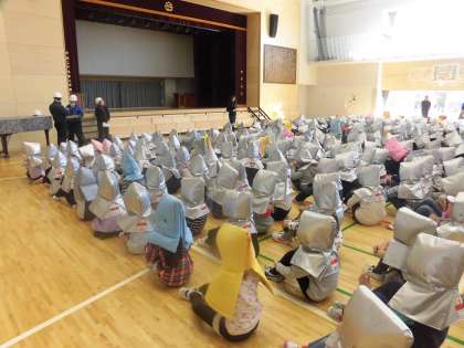 平成30年2月6日(火)10時40分〜10時55分(3校時)避難訓練が行われました。今回は「放送設備が使用不可になった時の避難方法を知る」ことがねらいとなりました。どの学年も落ち着いて行動をとることができました。職員も放送機器が使えないということもあり、リズム太鼓(小太鼓)や鐘を鳴らしながら各階の教室に避難指示を出すなどの方法をとりました。理科室からの出火ということで、カモメ階段は使えないという想定で、ヒバリ階段・ツバメ階段・オナガ階段とそれぞれの階段を静かに降りながら避難しました。本来ならば校庭への避難でしたが、ぬかるみなどあり、使用が難しいということで急遽、体育館で全体指導をしました。年度末最後の避難訓練では1年間の成果が期待できそうです。