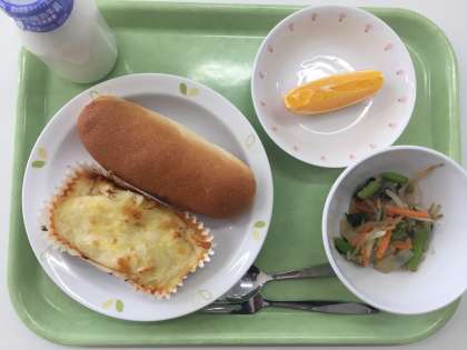 献立 米粉パン シェパーズパイ こんにゃくサラダ くだもの 牛乳