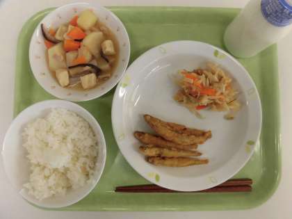 献立 ごはん わかさぎのカレー揚げ もやしいりはりはり漬け 凍り豆腐の炒め煮 牛乳