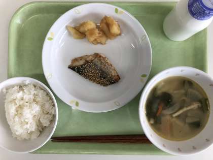 献立 ごはん さばのピリ辛焼き じゃが芋の甘辛煮 卯の花汁 牛乳