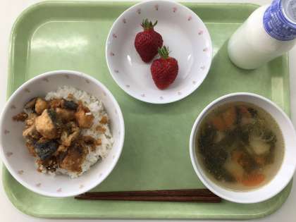 献立 しいらの揚げ煮丼 わかめスープ いちご 牛乳