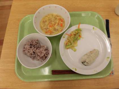 新学期の給食が始まりました。新しい学年になって初めての給食当番。みんな張り切って当番活動をしました。初日の給食は「黒米ごはん、鰆の桜蒸し、キャベツのごまサラダ、かき玉じる、牛乳」でした。季節を感じるメニューを美味しくいただきました。