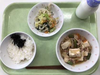 献立 ごはん ひじきふりかけ 肉豆腐 みそドレサラダ 牛乳