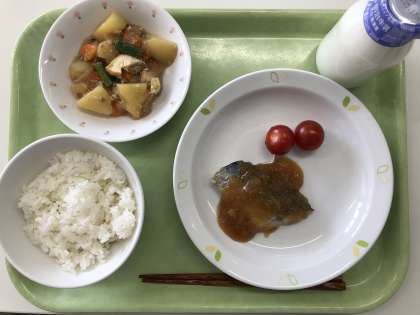 献立 ごはん 鰆のおろしだれ ミニトマト 新じゃがのそぼろ煮 牛乳