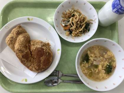 献立 黄な粉揚げパン トマトとレタスのスープ 油揚げのサラダ 牛乳