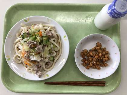 献立 冷しゃぶうどん 大豆とじゃこの甘辛揚げ 牛乳