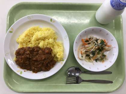 献立 エリンギのキーマカレー みそドレサラダ 牛乳