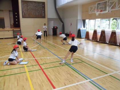 6月6日(水)・7日(木)本校校庭と体育館で体力テストが行われました。体育館では20メートルシャトルランをした後、グループごとに長座体前くつ、反復横跳び、立ち幅跳び、上体起こしの4種目を行いました。特に20メートルシャトルランでは、長い間走っている児童に対して自然にはくしゅが起こり、みんな達成感に満ちていました。