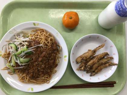 献立 ジャージャー麺 きびなごのフリッター 果物 牛乳