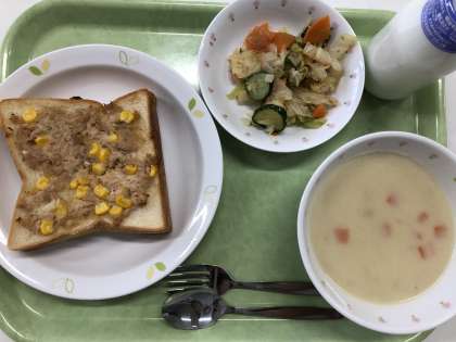 献立 ツナトースト じゃが芋のポタージュ きゃべつのごまサラダ 牛乳