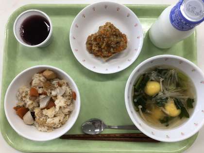 献立 里芋ごはん 高野豆腐のそぼろあん 月見汁 ぶどうゼリー 牛乳