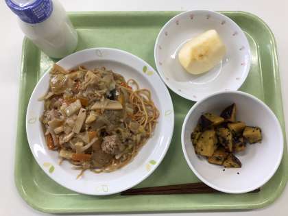 献立 あんかけ焼きそば 大学芋 りんご 牛乳