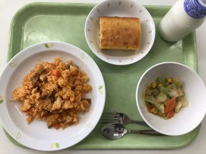 献立 チキンライス コーンサラダ ぐりとぐらのカステラ 牛乳
