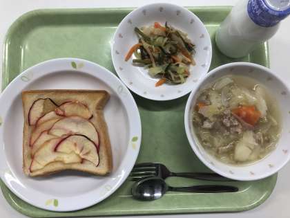 献立 りんごトースト ポトフ 茎わかめのサラダ 牛乳