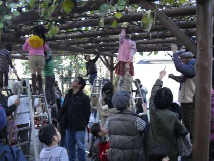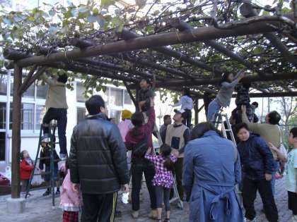 学校の中庭にあるキウイフルーツの木が、たくさんの実をつけました。12月4日(土)の午後から、「親子キウイフルーツ狩り」を行いました。小さな実はピンポン玉くらい、大きい実は市販のキウイと変わらないほどの大きさでした!キウイ棚は、たくさんの親子連れで大にぎわい。1時間ほどで、すべての実が採り尽くされました。少し硬めの実は、リンゴと一緒に、ビニル袋に入れておくと、熟して食べごろになります。