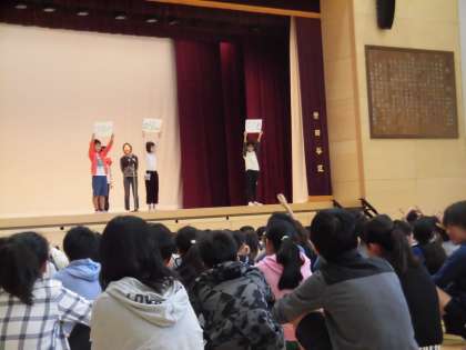 11月2日(金)は、城山小学校の58才のお誕生日でした。一足先に、10月29日(月)にお誕生日のお祝い、開校記念集会がありました。代表委員会を中心に、クイズあり、歌ありの、楽しい集会が行われました。城山小学校、おめでとう!