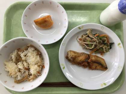 献立 加薬ごはん しいらのフリッター 胡麻和え 柿 牛乳