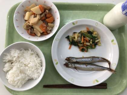 献立 ごはん 焼きししゃも 白菜のポン酢和え 野菜と車麩の煮物 牛乳