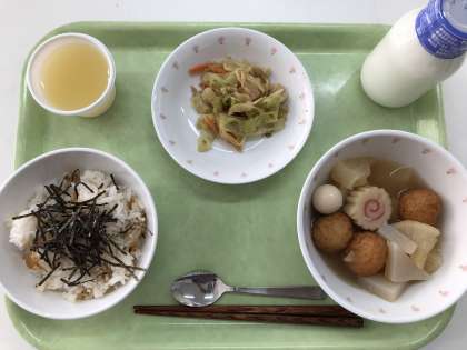 献立 こうし飯 高知のおでん ごぼうサラダ かわちばんかんゼリー 牛乳