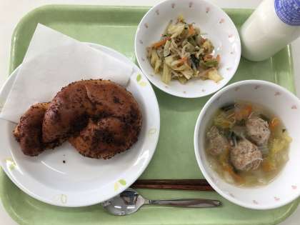 献立 ココア揚げパン 肉団子と春雨のスープ 野菜のごまみそ炒め 牛乳