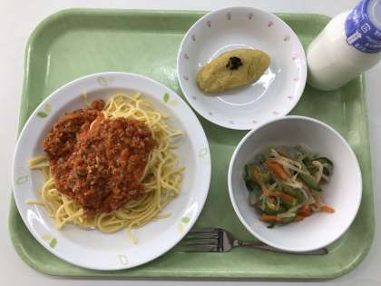 献立 スパゲティミートソース こんにゃくサラダ スィートポテト 牛乳