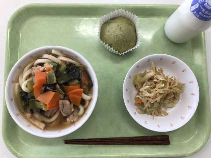 献立 わかめうどん もやしサラダ よもぎ蒸しパン 牛乳