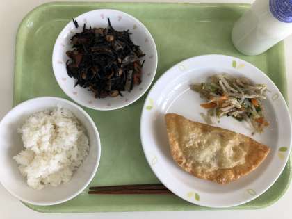 献立 ご飯 ジャンボ餃子 塩ナムル ひじきの煮物 牛乳