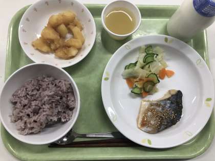 献立 黒米おこわ サワラの梅だれ ひとしお野菜 じゃが芋の甘辛煮 かわちばんかんゼリー 牛乳