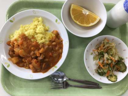 献立 ガーリックライス ポークビーンズ きゃべつのゴマサラダ かわちばんかん 牛乳