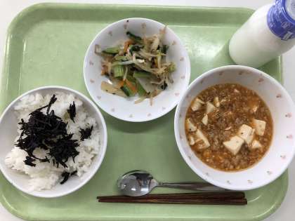 献立 ごはん ひじきふりかけ シーホー豆腐 こんにゃくサラダ 牛乳